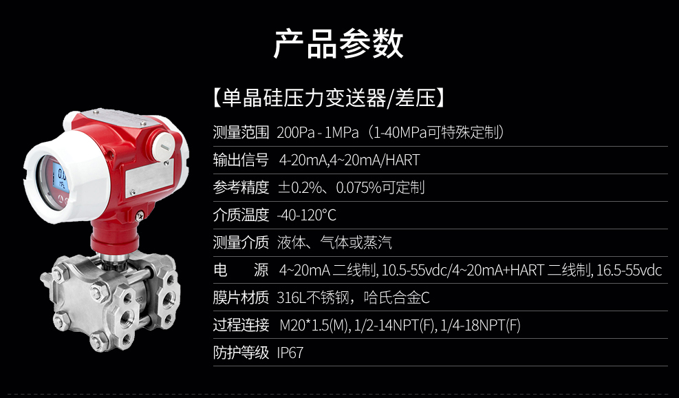 差壓安裝式表壓/絕壓變送器用于測量液體、氣體或蒸汽的液位、密度、壓力,然后將其轉變成4~20mADC HART電流信號輸出。采用先進的高精度單晶硅技術,測量精度高達0.075級,特有的雙過載保護膜設計,單向過壓高達3MPa